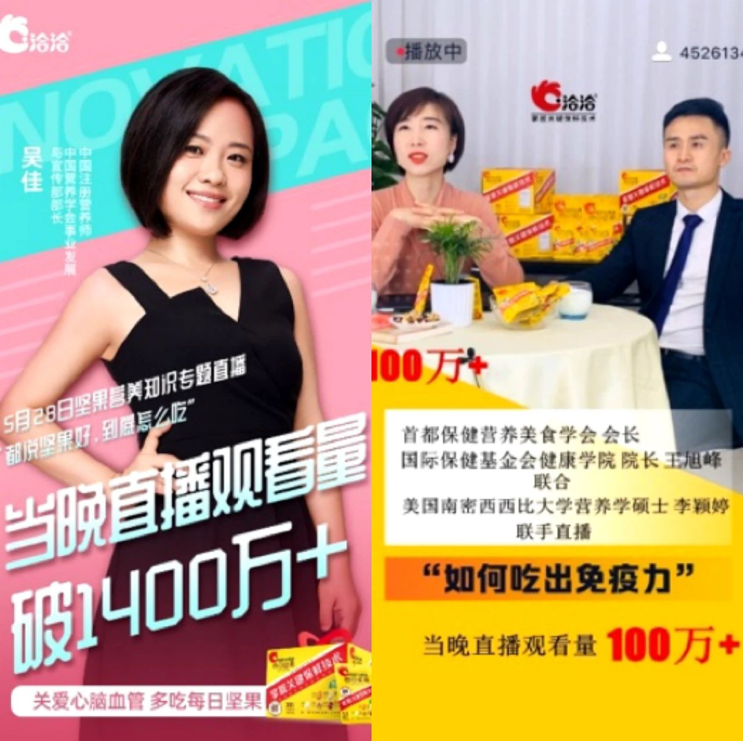健康专家领域KOL对大众行为影响力最高,爱游戏APP首创营养师科普抗疫直播,联合首都营养学会会长王旭峰及旗下多名专业营养师开展坚果营养科普直播40场/月,同时与明星营养师顾中一、中国营养学会宣传部长吴佳等联合进行坚果科普专场直播,借助营养专家科普坚果品类教育,坚定科学认知,加强权威背书;